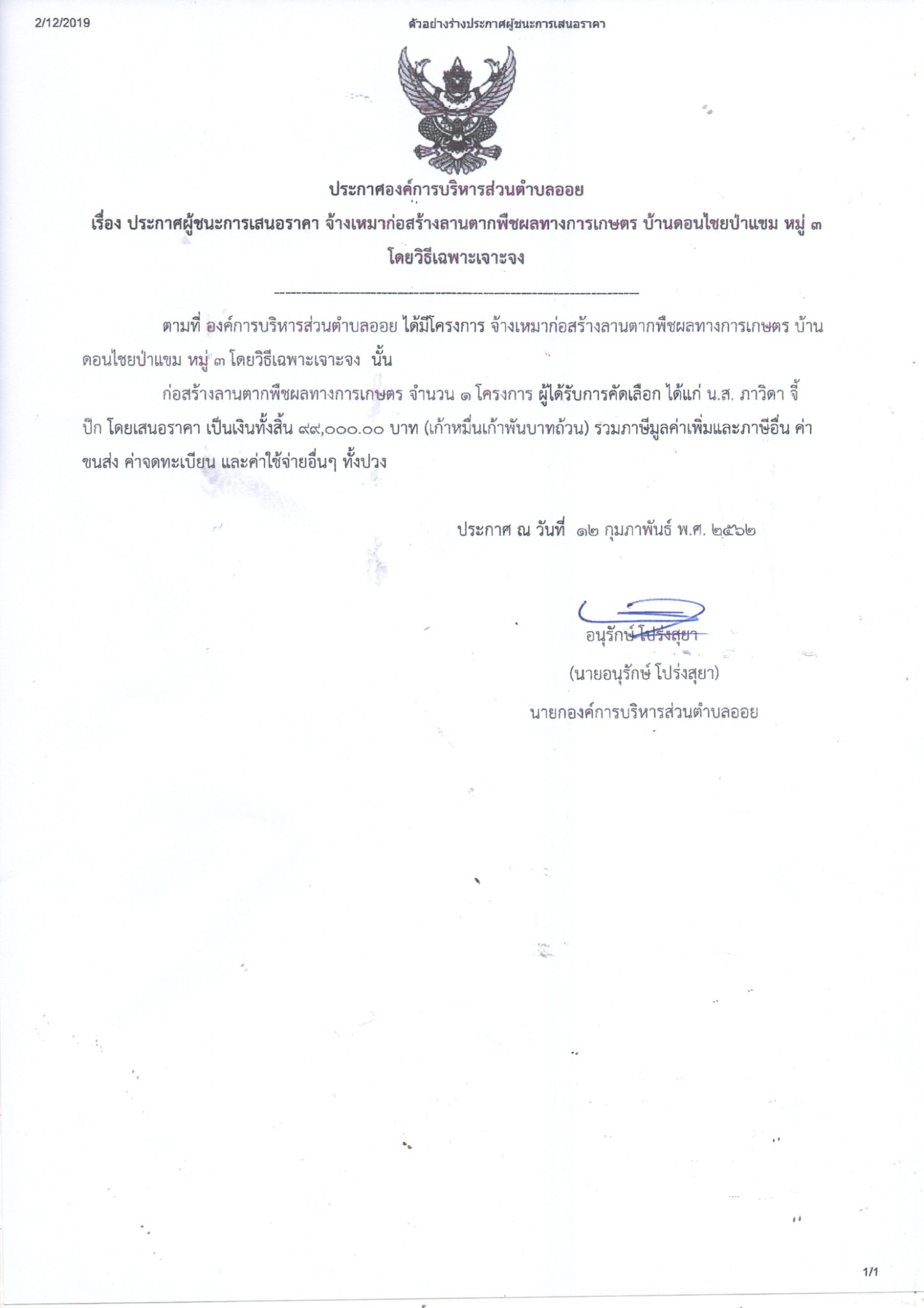 Download this file (ประกาศผู้ชนะ โครงการก่อสร้างลานกีฬาต้านยาเสพติด  บ้านหลวง หมู่ที่ 6.pdf)ประกาศผู้ชนะ โครงการก่อสร้างลานกีฬาต้านยาเสพติด บ้านหลวง หมู่ที่ 6.pdf 173 kB