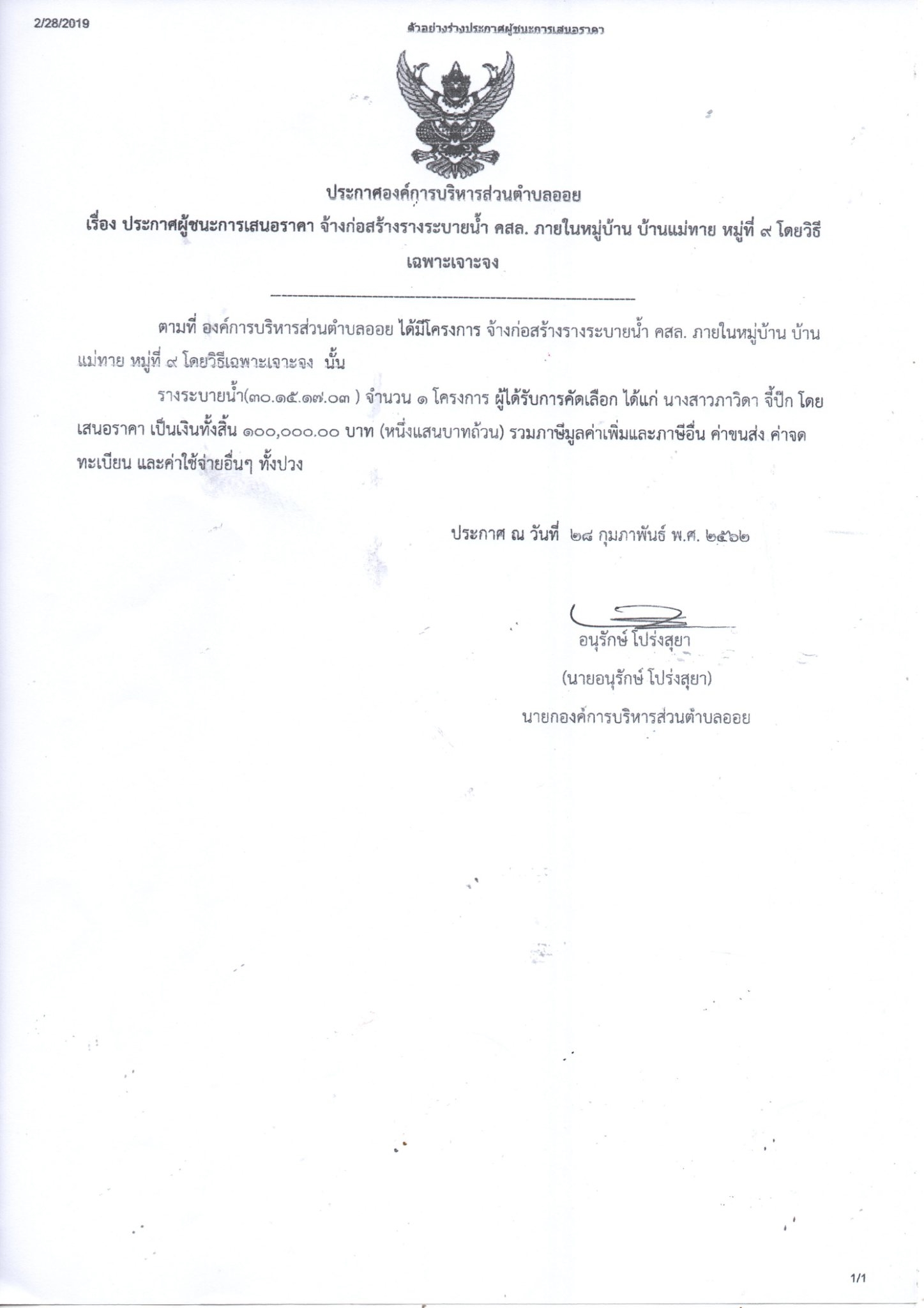 Download this file (ประกาศผู้ชนะการเสนอราคาจ้าง ขุดบ่อขยะ บ้านหล่าย หมู่ที่ 4.pdf)ประกาศผู้ชนะการเสนอราคาจ้าง ขุดบ่อขยะ บ้านหล่าย หมู่ที่ 4.pdf 44 kB