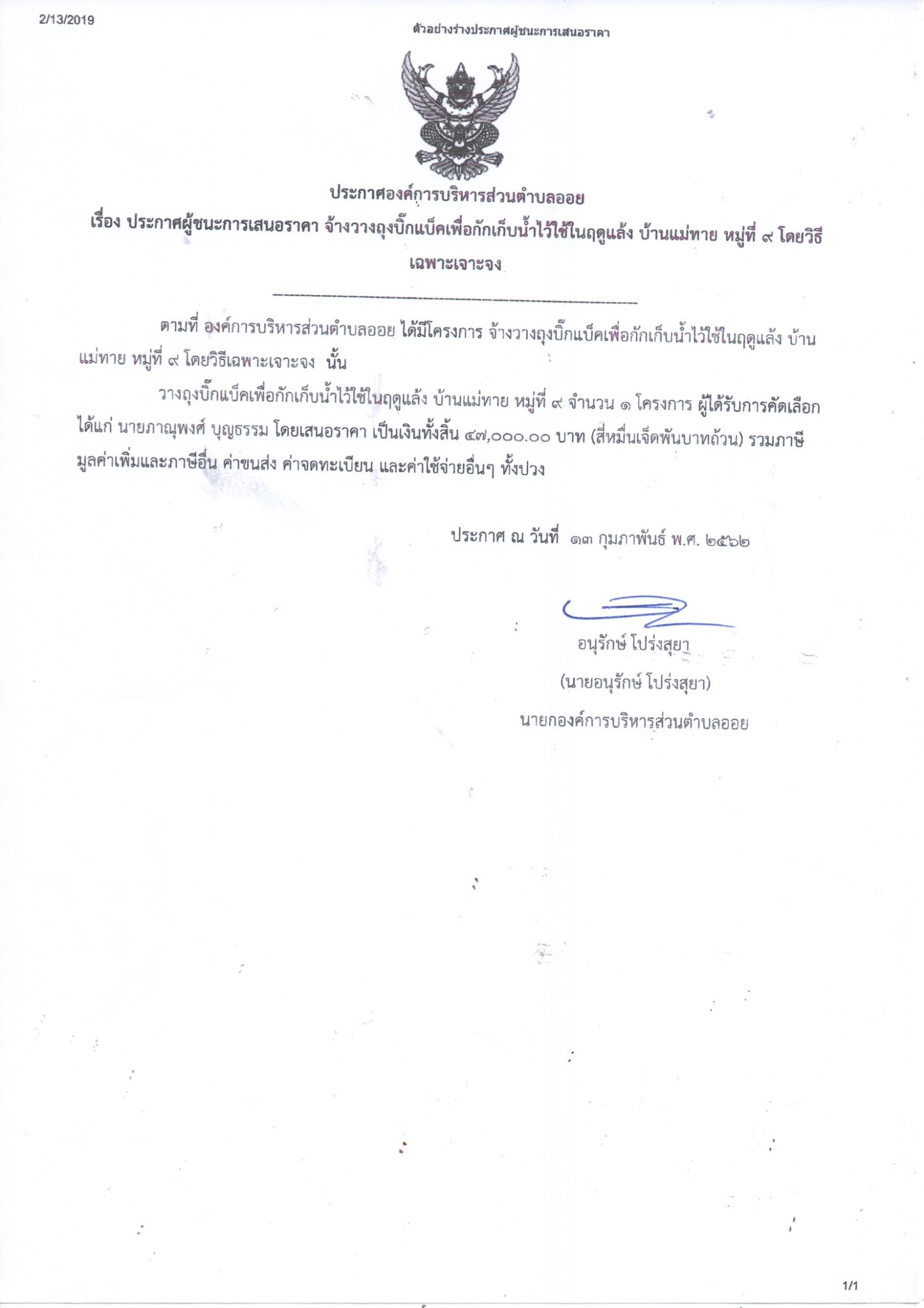 Download this file (ประกาศผู้ชนะเสนอราคา จ้างวางถุงบิ๊กแบ็ค บ้านหลวง หมู่ที่ 6.pdf)ประกาศผู้ชนะเสนอราคา จ้างวางถุงบิ๊กแบ็ค บ้านหลวง หมู่ที่ 6.pdf 45 kB